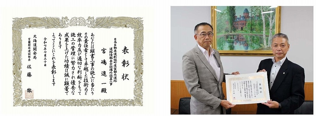 室蘭開発建設部から受注した「日高自動車道新冠町厚賀静内道路道路情報表示設備外設置工事」において、令和7年度北海道開発局優良工事等表彰(室蘭開発建設部⾧表彰)を受賞いたしました。