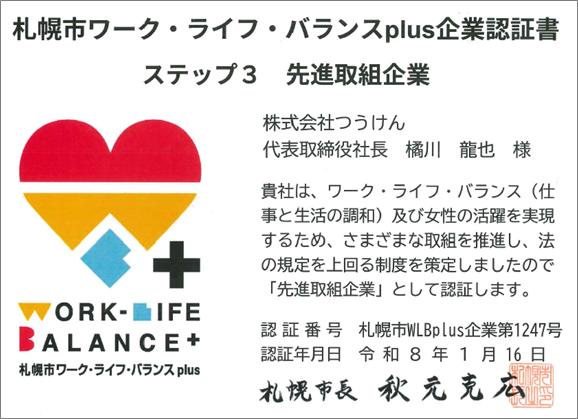 「札幌市ワーク・ライフ・バランスplus企業認証」は、仕事と家庭の両立を支援する企業を評価する制度です。 特に男女が共に活躍できる職場環境の整備や柔軟な働き方の実現に取り組む企業に、独自の基準で認証が行われます。
