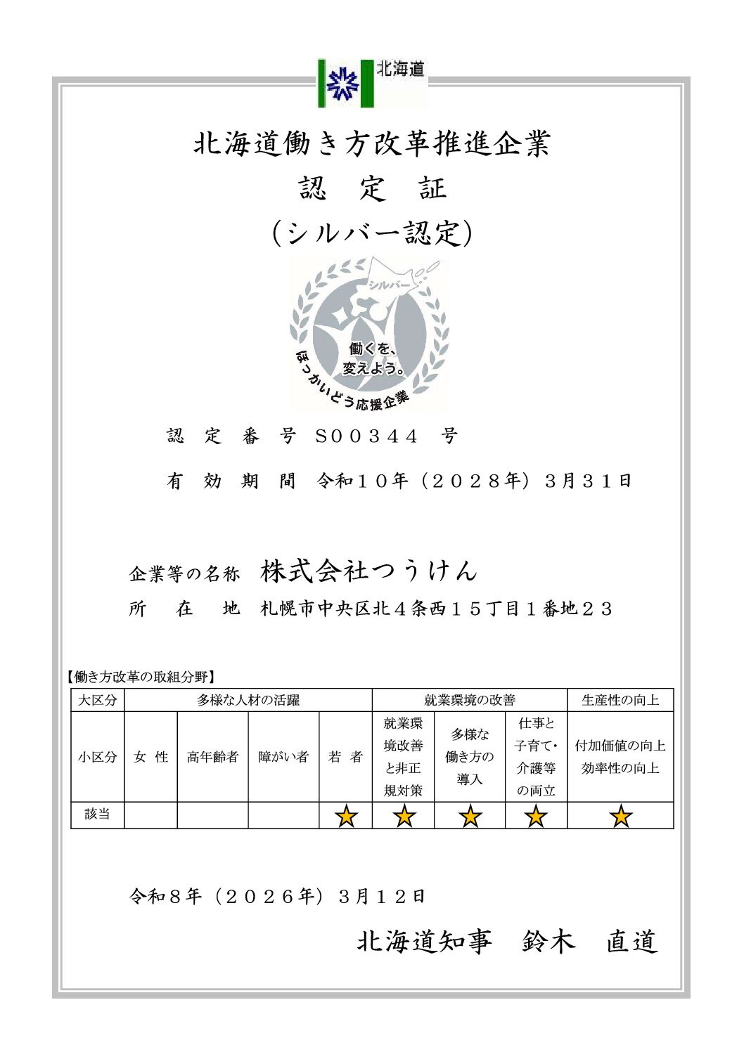 「生産性の向上」に積極的に取り組む企業を認定し、道内企業の働き方改革への取り組みを